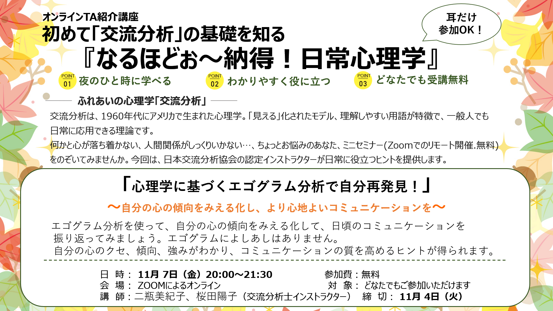 交流分析の普及を通じ、“快い対人関係づくり”を目指します。